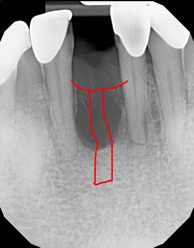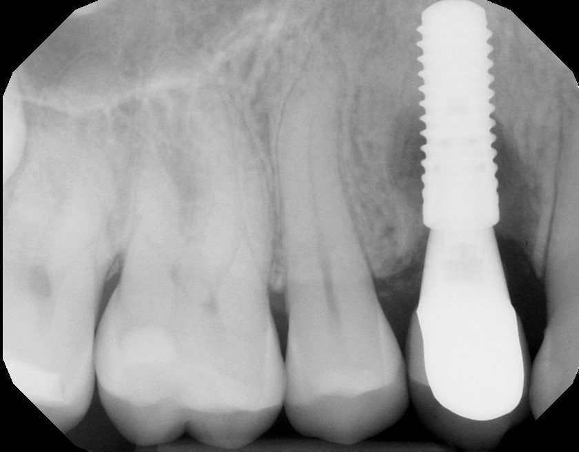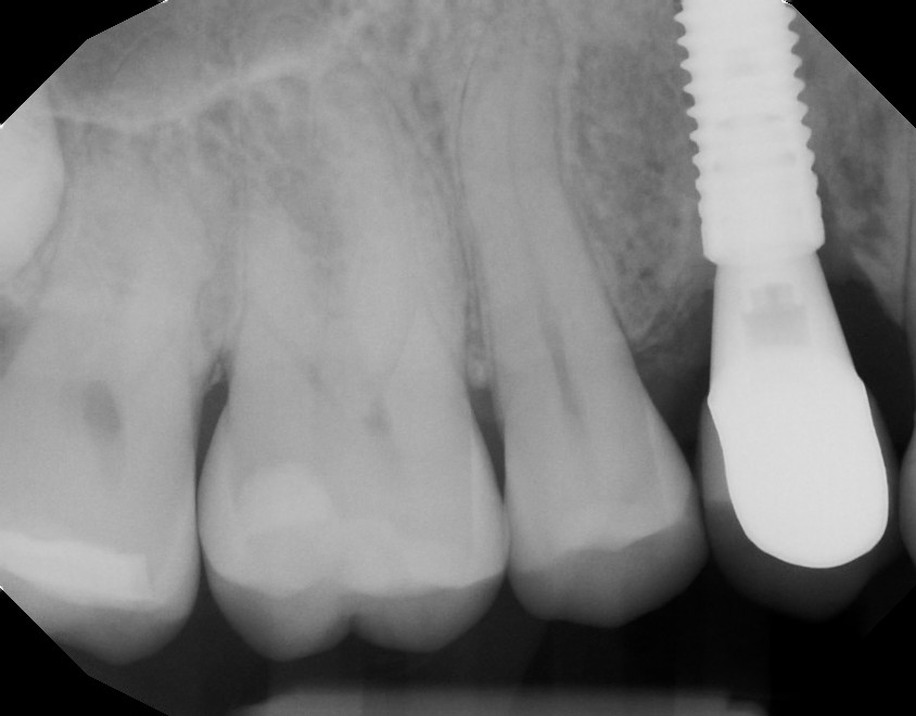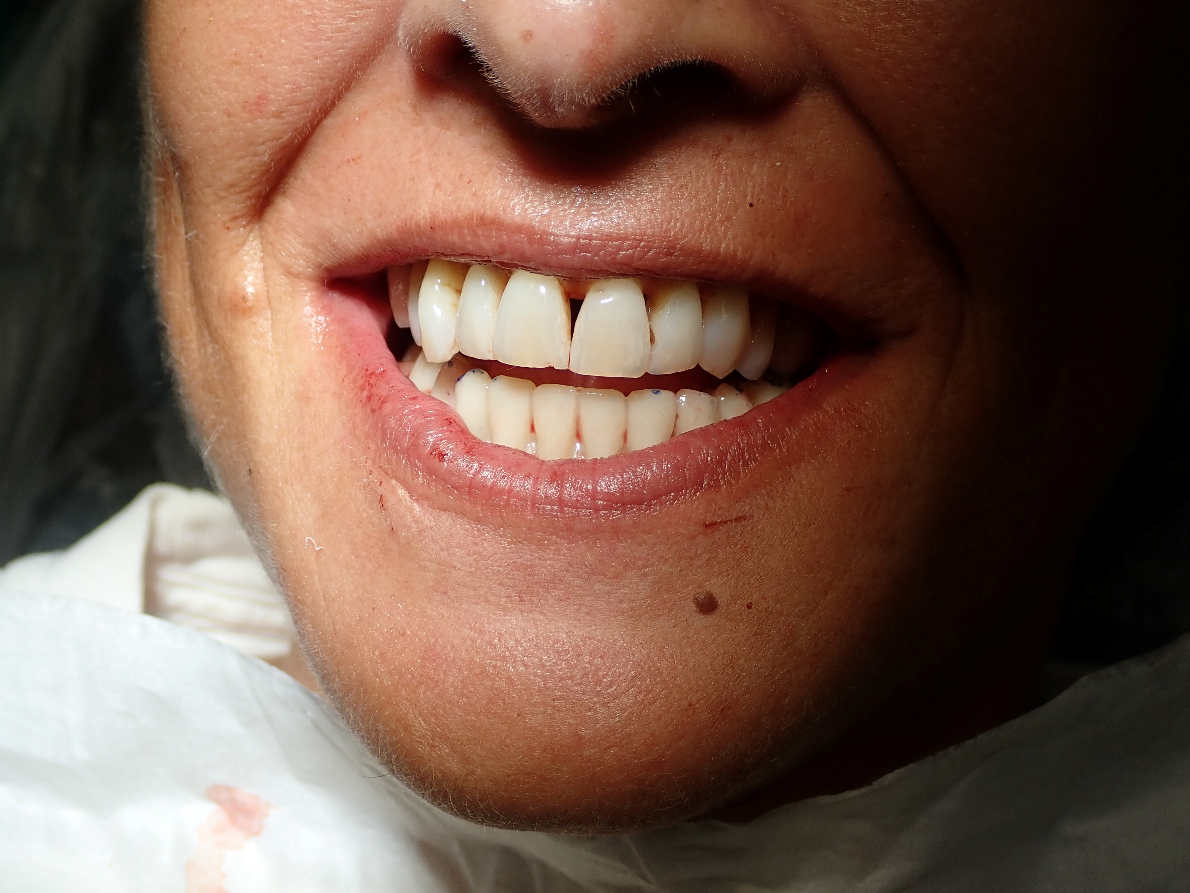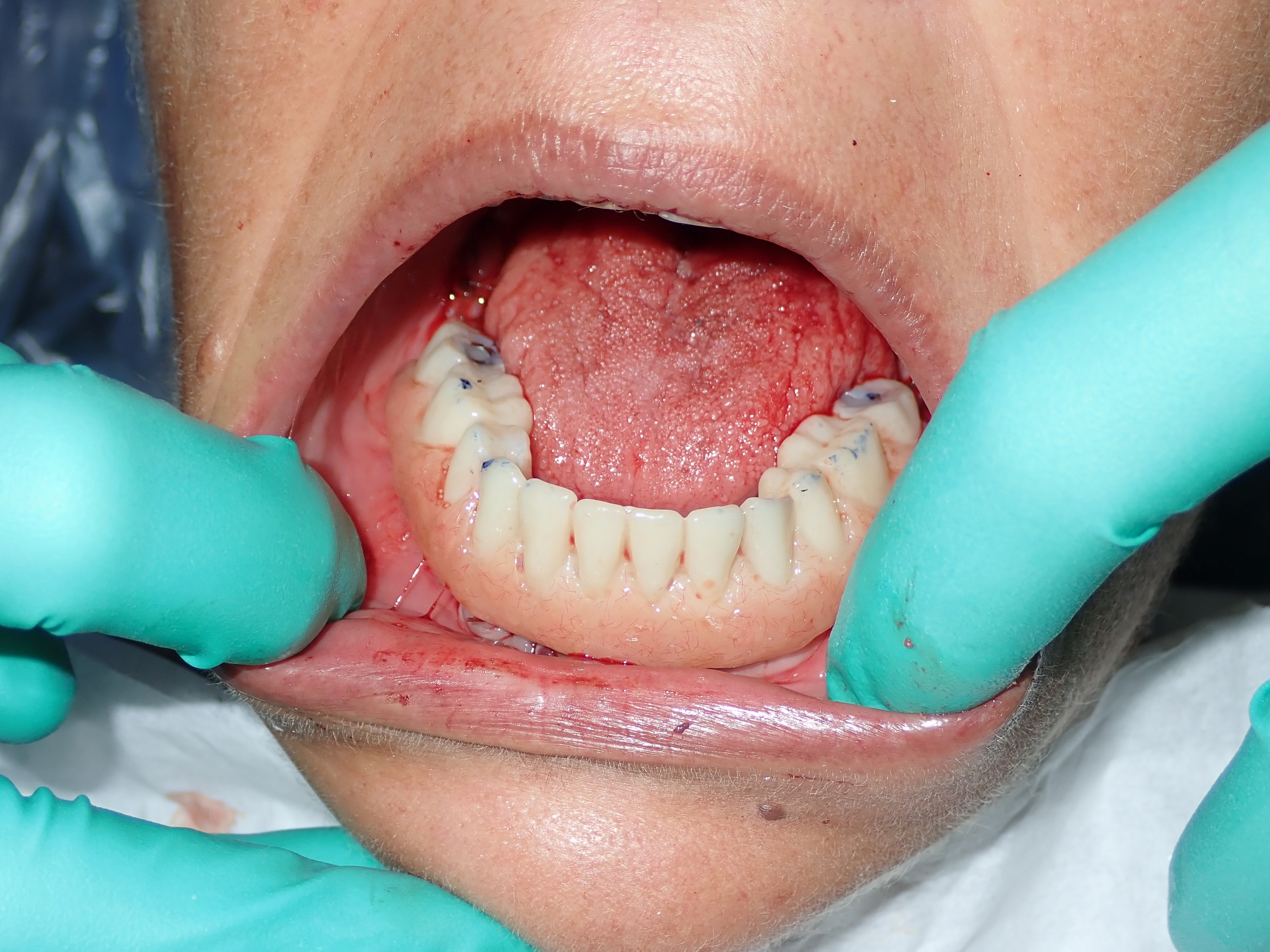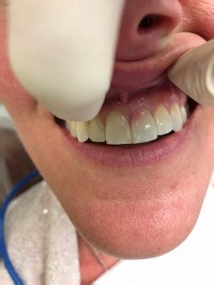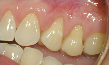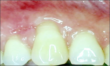 This patient caused gum recession from aggressive tooth brushing. The patient's own tissue was placed over the root to correct the damage caused by traumatic brushing.