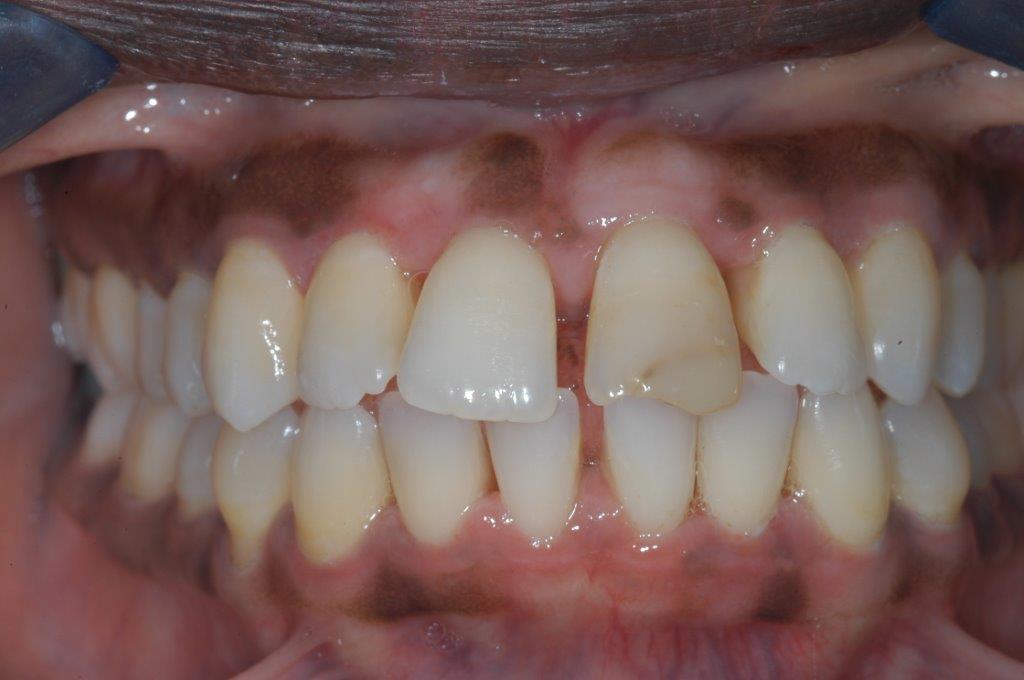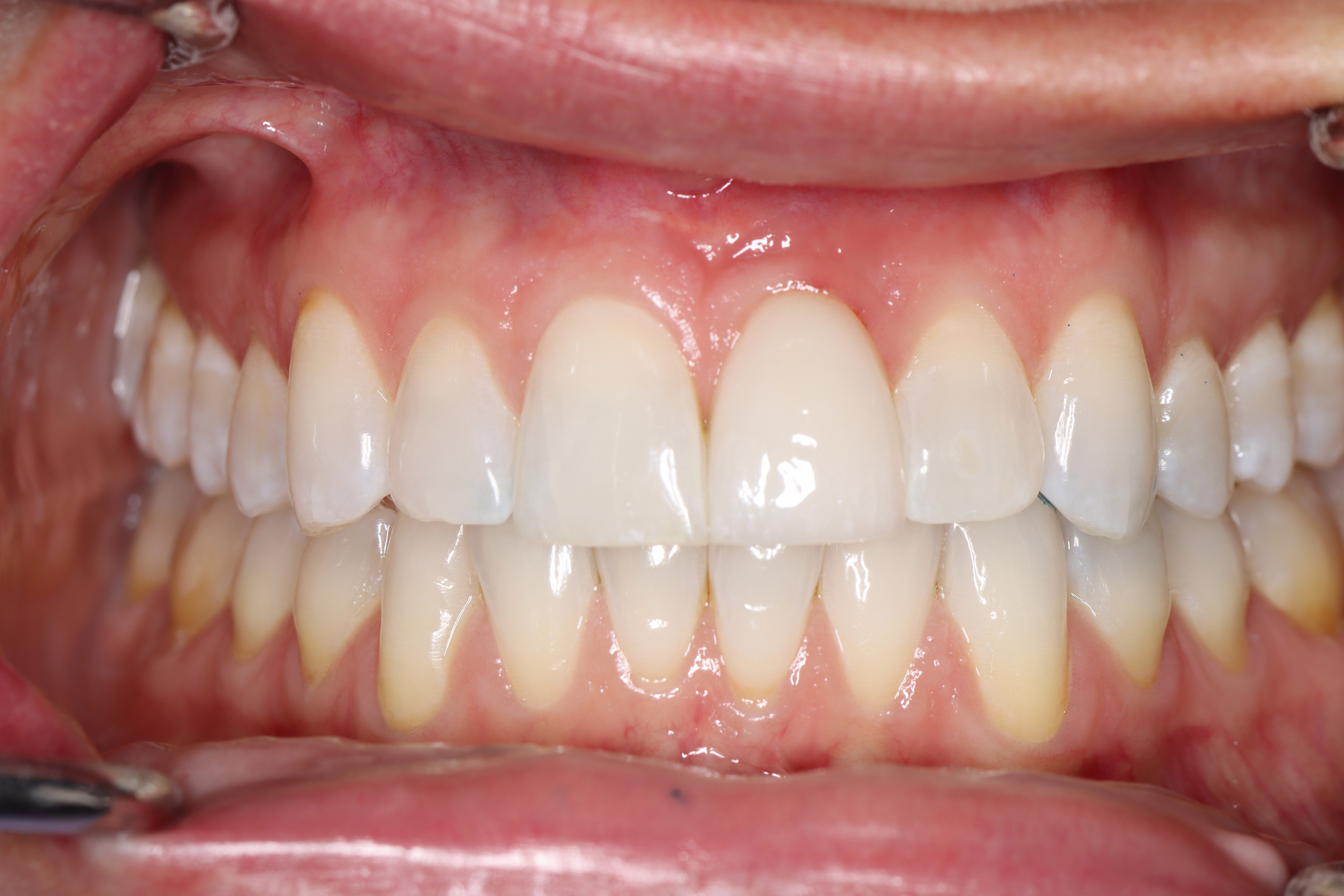 This patient experienced many areas of gum recession, primarily on the upper and lower front teeth. This patient's own tissue was used to correct the problem.