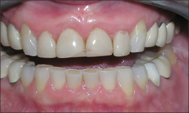 Here you can see recession on the pre-molars. This root exposure causes sensitivity to hot, cold and brushing. This area was grafted with Alloderm. Alloderm does not require tissue from the patient's mouth. With Alloderm, the patient had only one site to heal. Click on a thumbnail below to view the before and after photos.